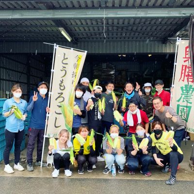 さて、今日は福岡市内で飲食店を展開されている、アトモスダイニング株式会社さんのみなさんにとうもろこしの収穫、袋詰め作業のお手伝いに来て頂きました♪